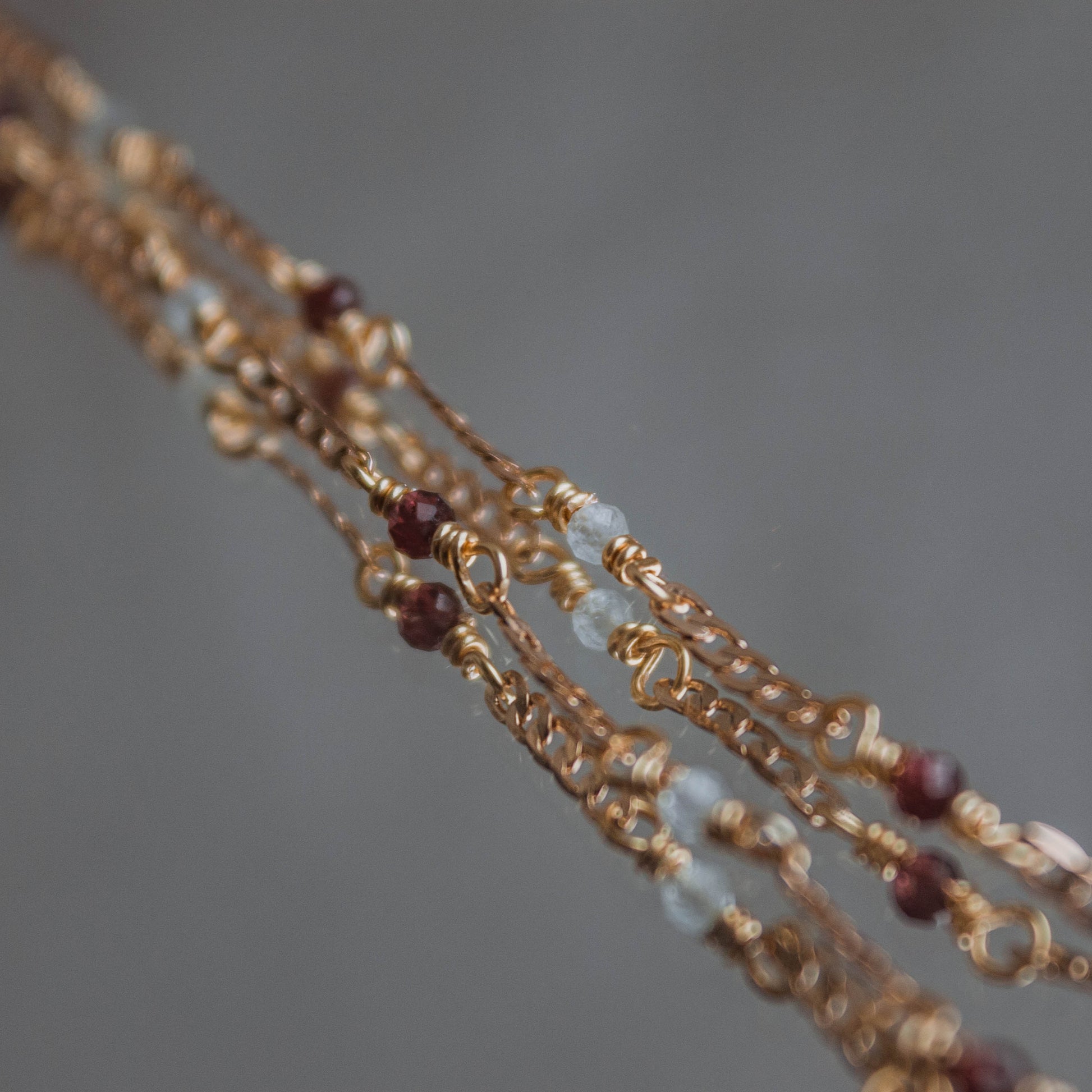 Medidas de Cadena: Cadenita de 40.0cm de largo + Mini esferas facetadas de Granate & Aguamarina